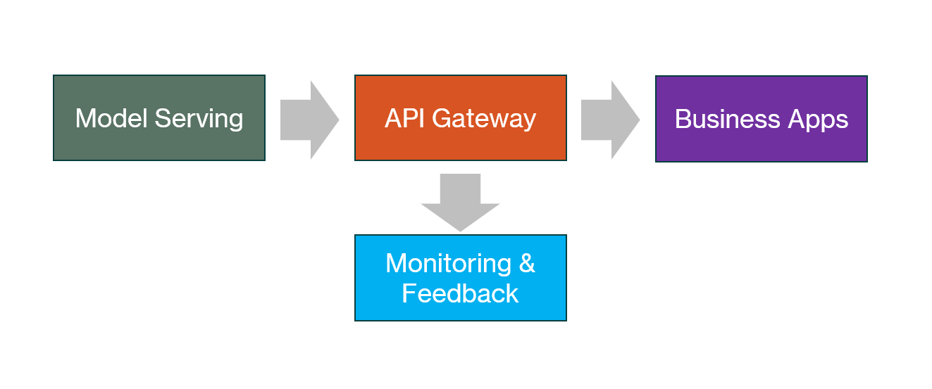 Model serving layer with API gateway, observability stack, and feedback loop automation.